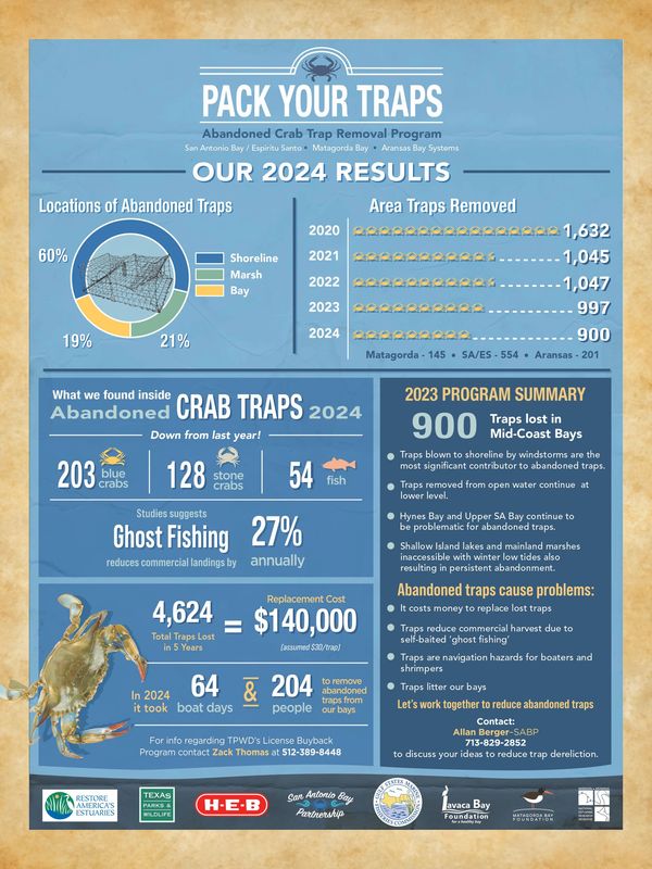 Licensed and recreational crabbers use traps to capture blue crabs on the Texas coast. Unfortunately, the crabber sometimes loses or does not retrieve the traps. These abandoned traps are a significant source of mortality for marine organisms, many of which are recreationally or commercially important.